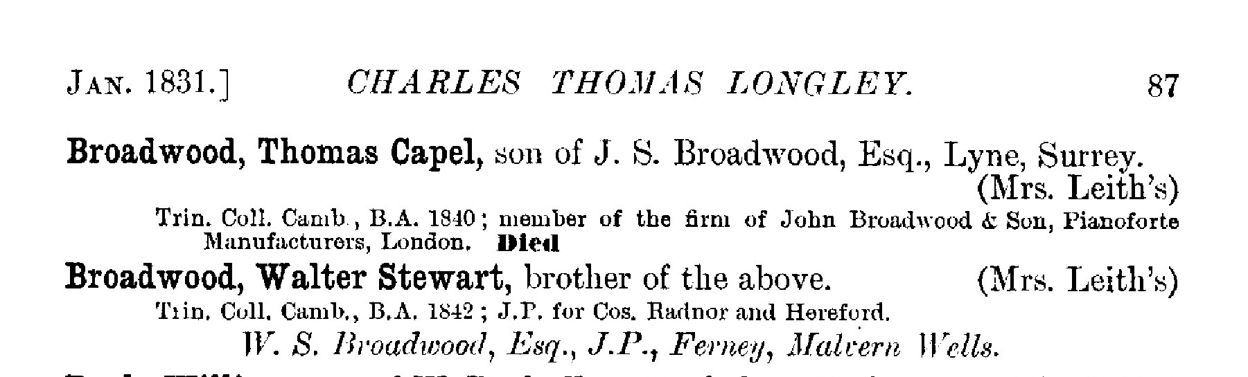 Here’s Miss Broadwood on the 1881 census, not too clear, but it says Alice Isobel Broadwood, her father was Walter Stuart Broadwood, J.P. For Herefordshire & Radnorshire: