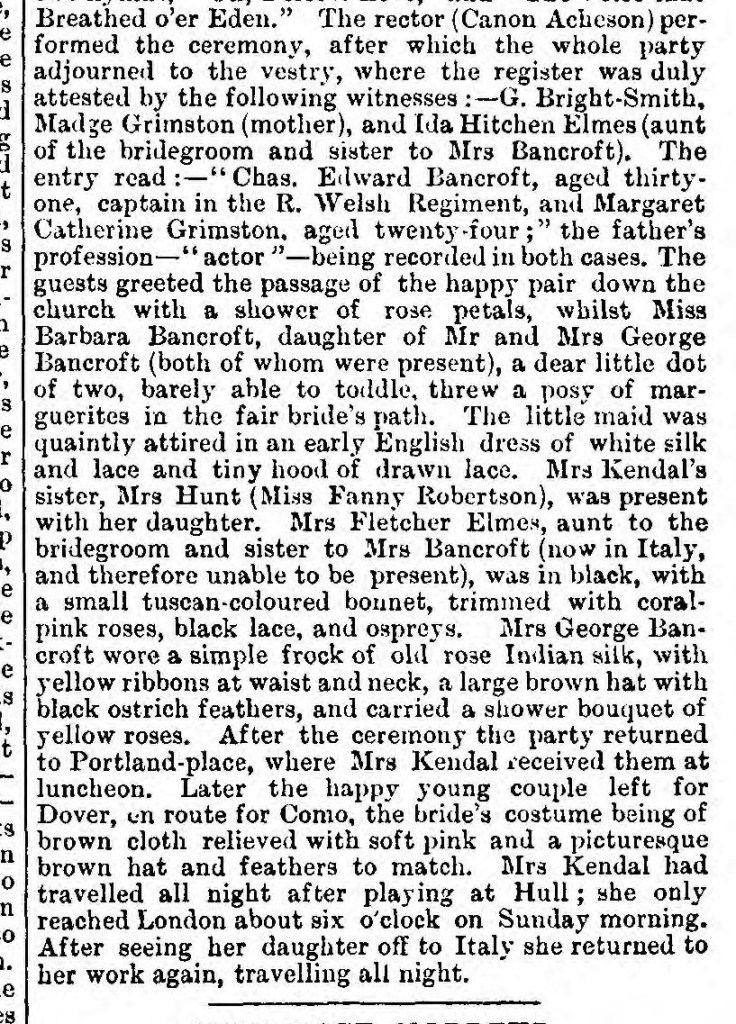 The newspapers didn’t report the couple’s marriage until the first week of January. Squire Bancroft had been employed by Marie as her leading actor in her theatre before they became a couple.