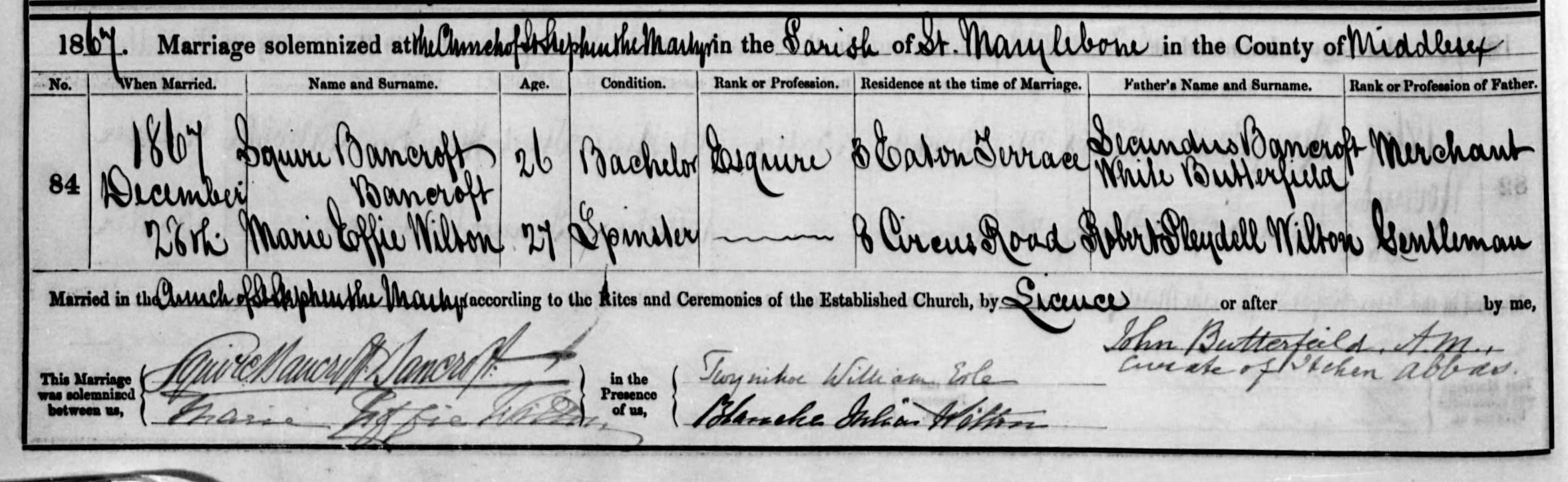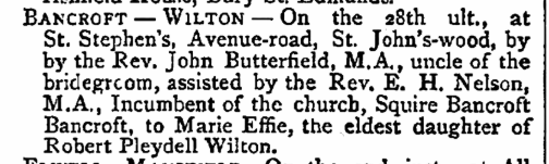 Squire Bancroft had changed his name by Deed Poll on 13 December 1867, just two weeks before their marriage.