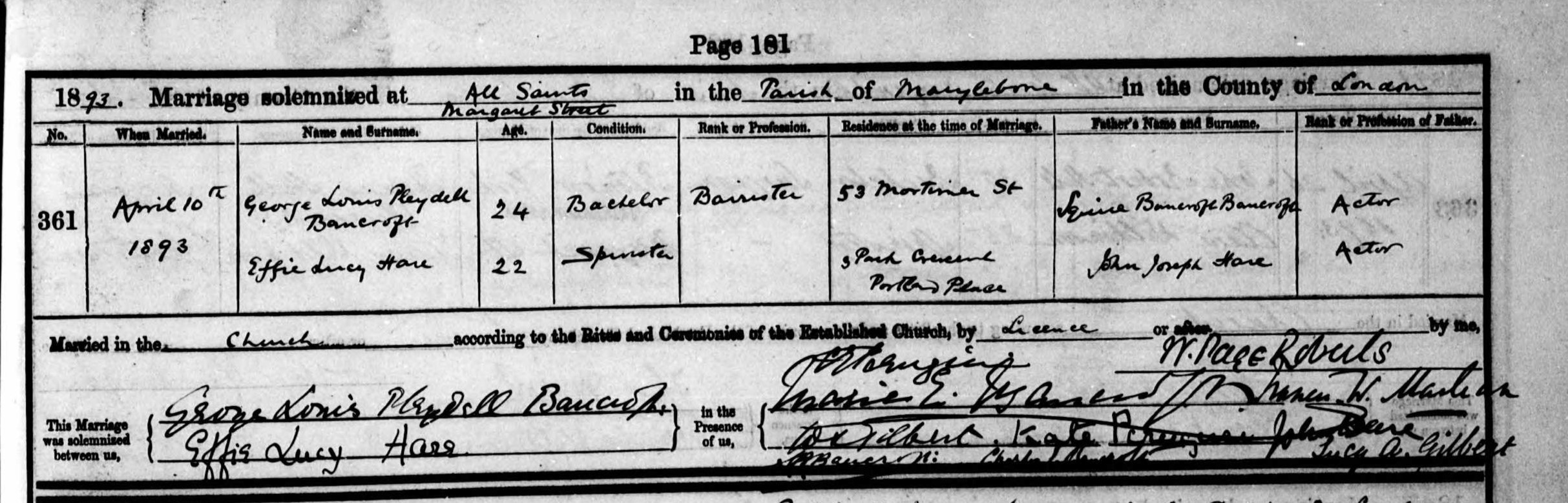 Marie had one daughter and three sons: Florence Ellen Blanch Baker Wilton, and Charles Edward Wilton, born before she was married, and then two sons with Squire Bancroft. Firstly, George Louis Pleydell Bancroft (1868-1956) was a Lawyer and Writer. He married Effie Lucy Hare on 10 April 1893, in Marylebone, Middlesex, England.