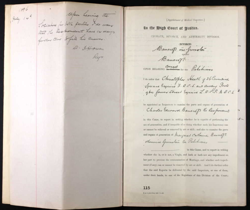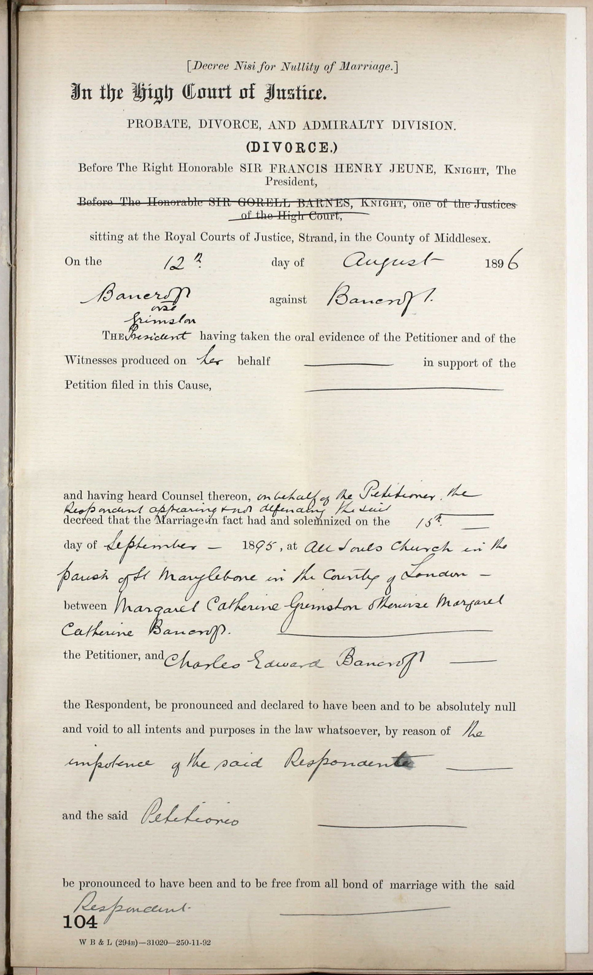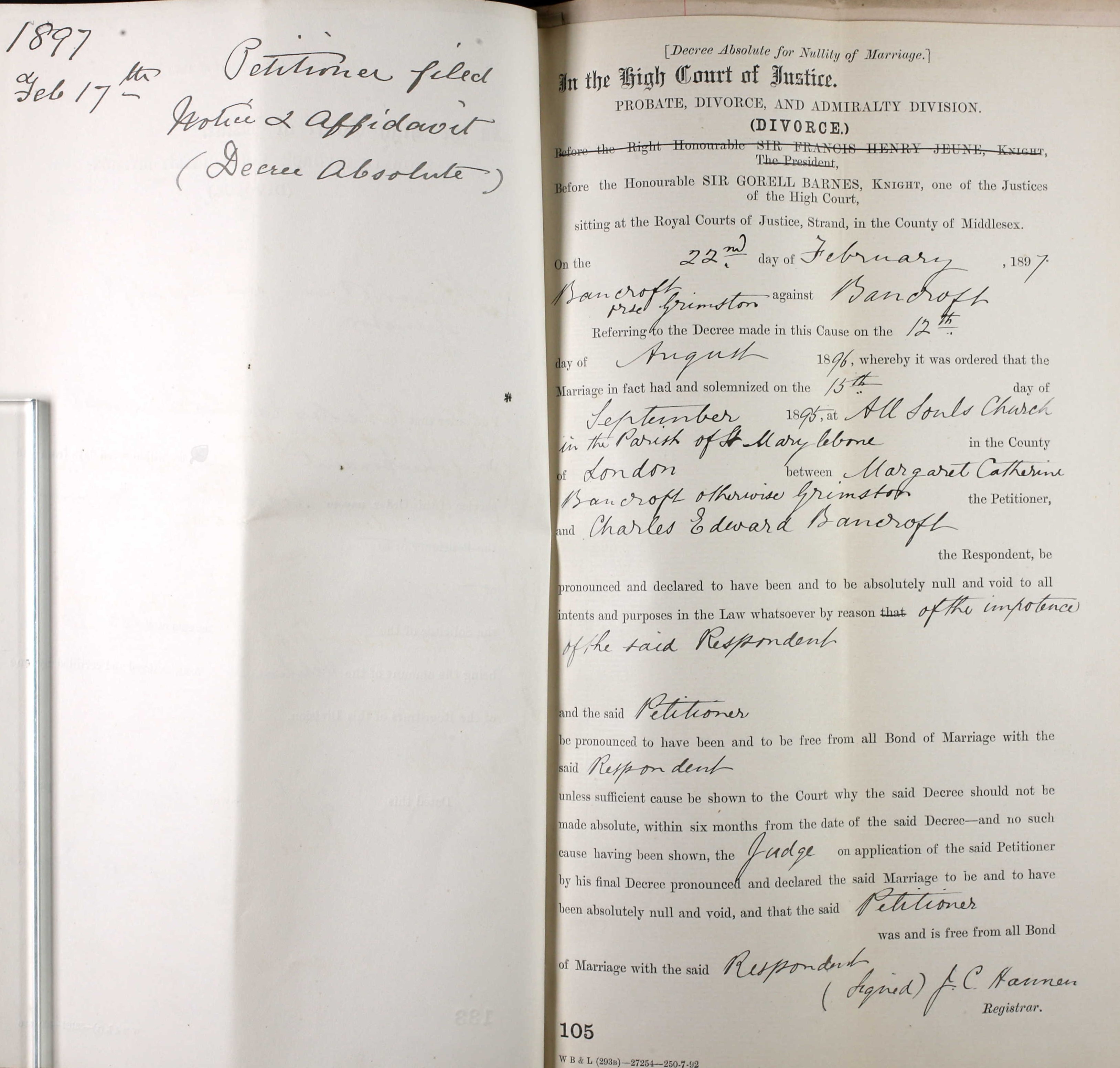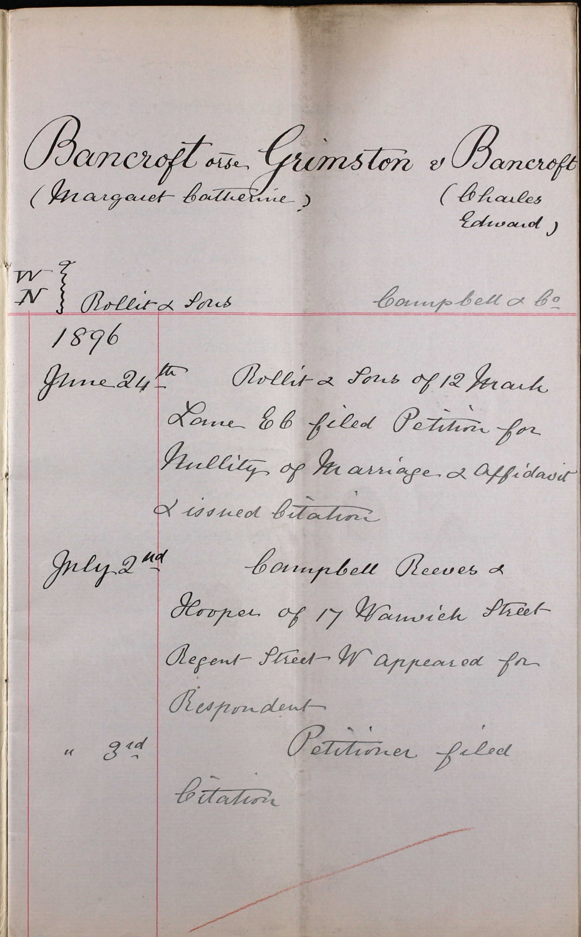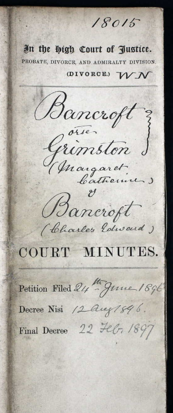 National Archives, Divorce Court File: 18015. Appellant: Margaret Catherine Bancroft, otherwise Margaret Catherine Grimston. Respondent: Charles Edward Bancroft. Type: Wife’s petition for/of nullity