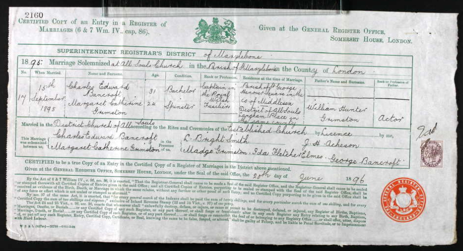 Charles was still a Captain in the Royal Welsh Fusiliers when he married Margaret Catherine Grimston on 15 September 1895.