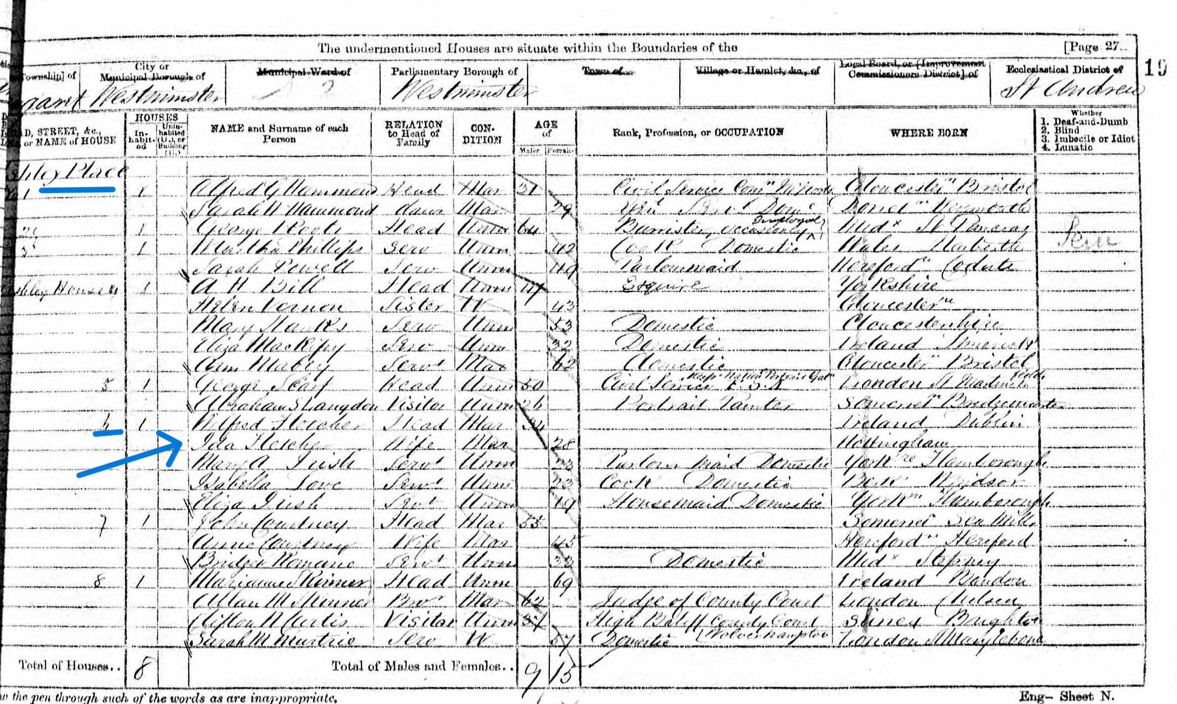 More questions than answers, I think, here, as I’ve found nothing more to help, I can’t find or identify Martha Easton. It also looks like 107 Victoria Street, Westminster, is missing from the 1861 census.