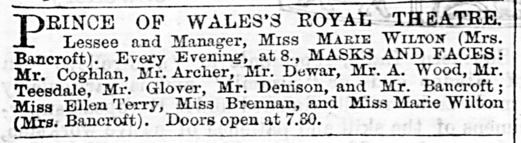 Marie borrowed £1000 from her brother-in-law, Francis Ashton Drake 1835-1901, a Barrister, who had married her sister Emma in 1863. He offered her the money at the end of 1864 so that she could enter Theatre management. She did so jointly with Henry James Byron (1835-1884), who was an editor, journalist, director, theatre manager, novelist and actor. (He was Lord Byron’s second cousin)This was in 1865, at the renamed Prince of Wales’s Theatre, where she produced and acted in many plays, including the comedies of Thomas William Robertson (1829-1871), (he was Madge Robertson/Kendal’s brother), such as Society in 1865.