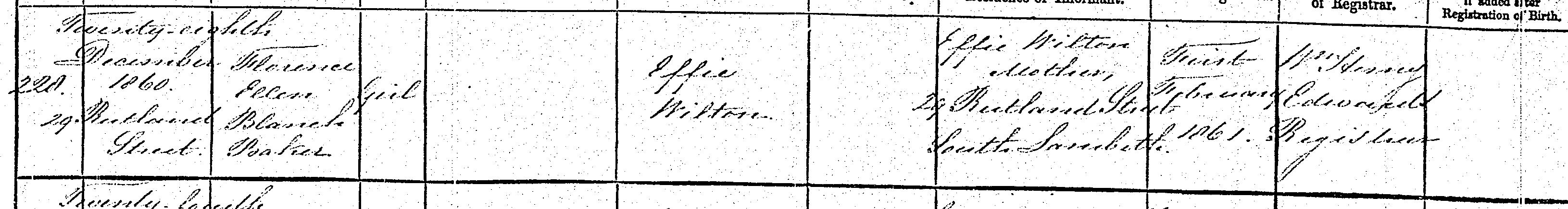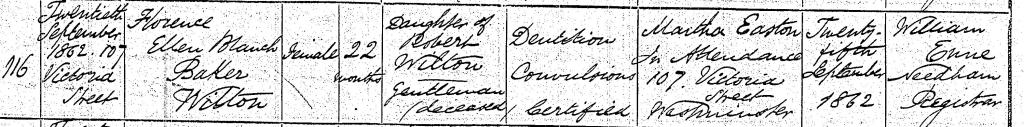 On 28 December 1860, Marie gave birth to a daughter, Florence Ellen Blanch Baker Wilton, at 29 Bertrand Street, South Lambeth, London. As you can see on her birth record registered by her mother, Marie Effie Wilton, she just gave the name Effie Wilton with no father mentioned, but where does the name Baker come from? Is that a clue to the father of Florence? It’s not a family name that I have come across.