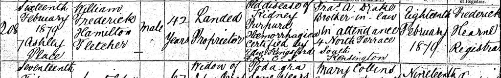 Theatregoers at the time were informed by the newspapers that she was taking a break in the country. Looking at all the clues from this time and after, I believe it’s very likely her sister, Ida, looked after Charles when Marie returned to work. In the newspapers, it was reported that Ida married early in life and retired from the stage; she didn’t, in fact, marry until 1874 at the age of 34. But I have found, looking through the 1871 census for Ida, that she is living at 6 Ashley Place with her future husband, William Frederick Hamilton Fletcher (1837-1879), with three servants. She is using his name Fletcher and has also shaved three years off her age, as she was born in 1840. Later, the couple lived at number 7 Ashley Place.
