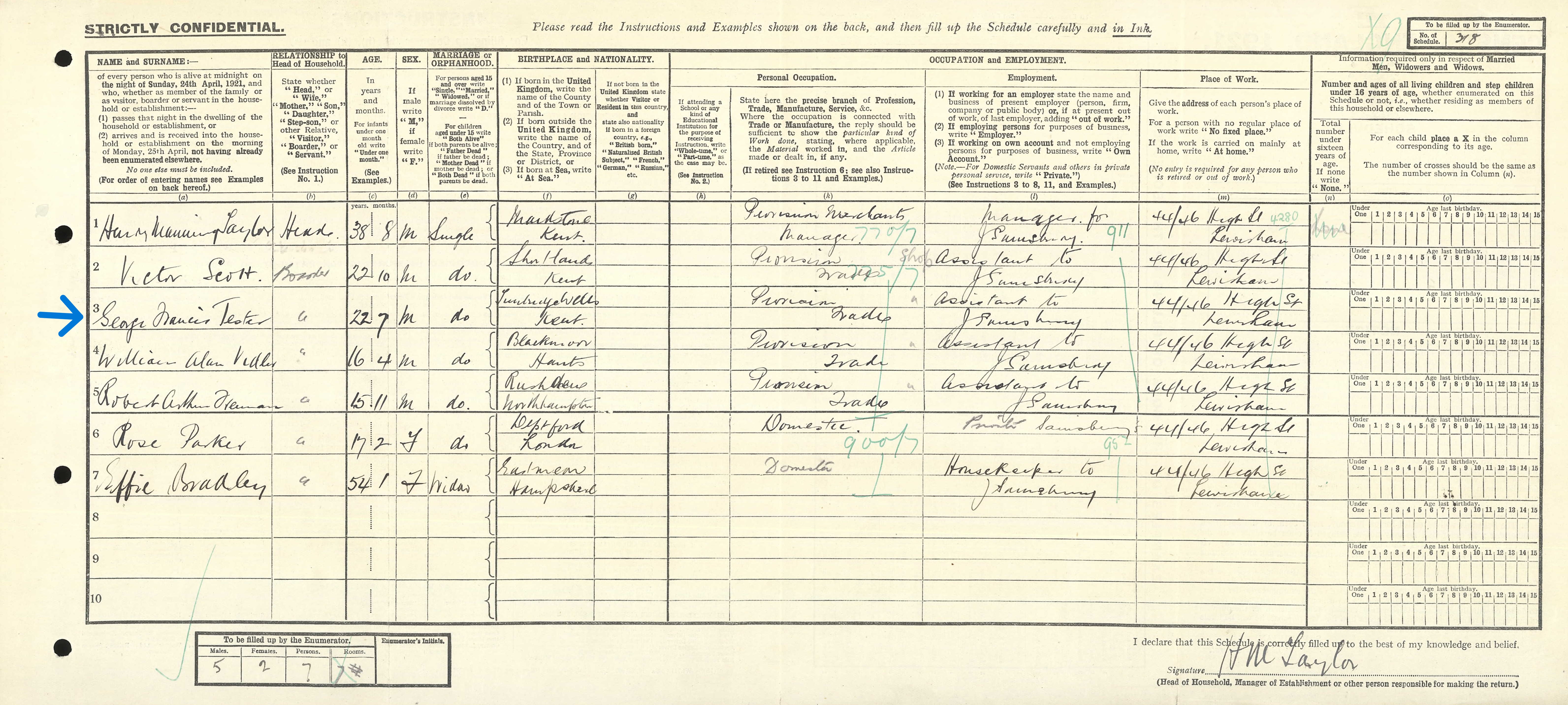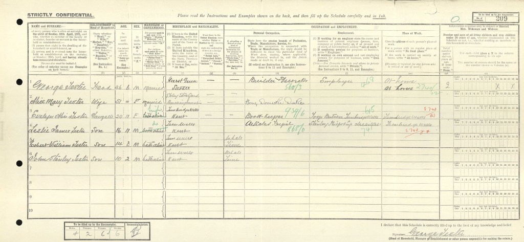 On the 1921 census (19 June 1921), George Francis Tester is now a young man of 22 years and 7 months, so that fits with his birth being November 1898. He is a boarder with his occupation being in the provision trade. Interestingly he is living and working at the premises of Sainsbury’s.