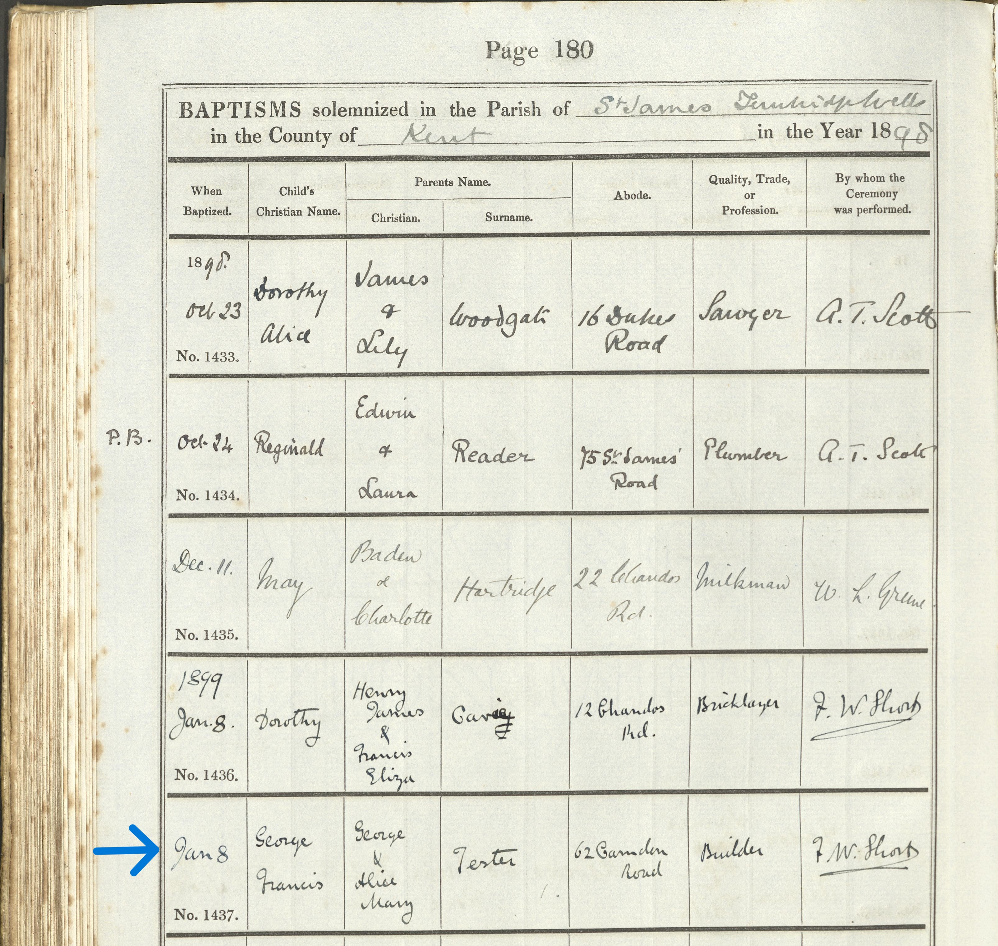 Starting with father George Tester, born on 21 December 1874, the son of Elizabeth and George. George married Alice Mary Lines in the second quarter of 1898 in Potterspury, Northamptonshire. In 1901 with their first two children, he was a self-employed Plumber and Decorator. Then 1911 he worked as a Shopfitter.