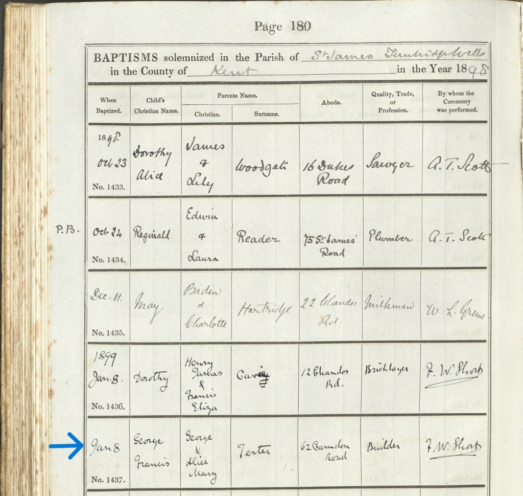Among several hints that have popped up on the tree since I started, not all are correct I have to add, was also a Baptism record for young George, but only a transcription. I was lucky and found the actual image on Find My Past, it definitely states the Baptism was on the 8 January 1899, so whoever wrote on the back may have made a slight error with the date or they had the photo taken a little later than the Baptism. Nevertheless, with all the other information gathered, I’m sure I have the correct family as the Father’s occupation and their address fit too.
