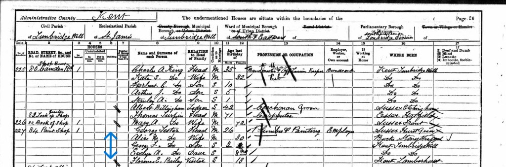After looking carefully at the 1901 first, here below, it’s definitely a possible match with George as the eldest child and a younger sister Evelyn. Father George’s occupation is a Plumber and Painter and the family live at 84 Camden Road, (Paint Shop) Tunbridge Wells.