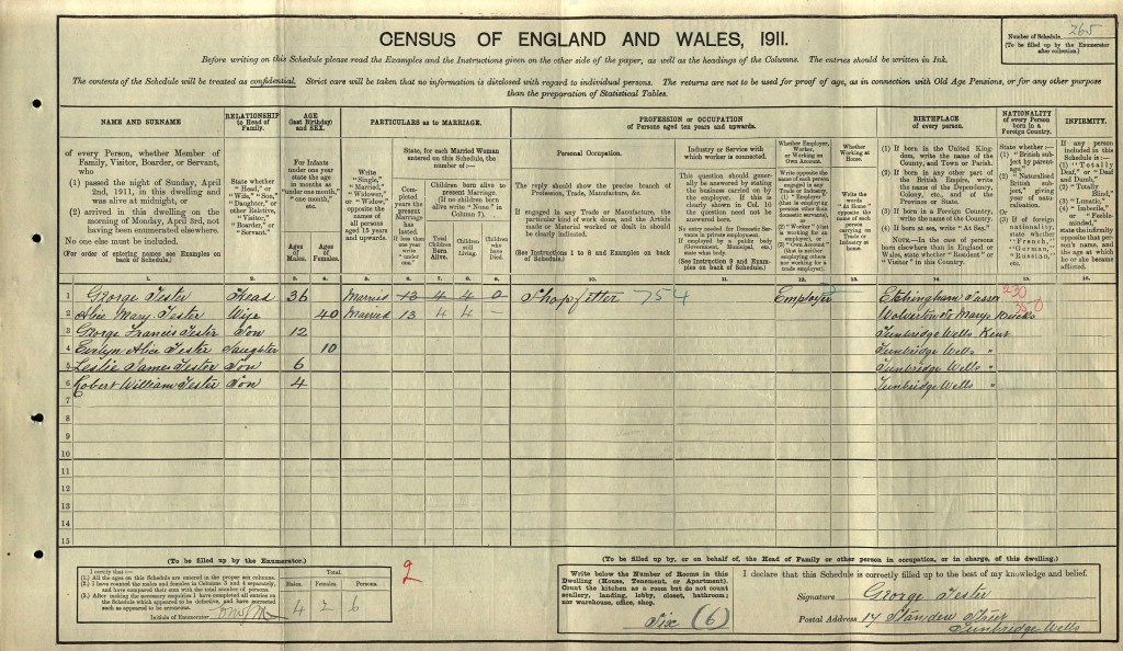1911 Father George is a Shopfitter and the family lives at 17 Standen Street, Tunbridge Wells, Kent.