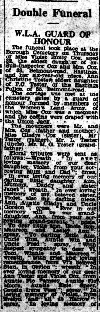 Just the first part of the double funeral report for Violet and Ann in the Hastings and St Leonard’s Observer on Saturday 29 May 1943, the funeral was on 27 May 1943 at the Borough Cemetery, Hastings, Sussex.