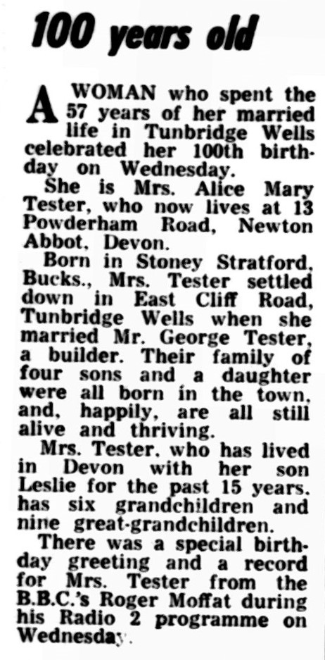 There was a celebration of mother Alice Mary reaching 100 years old reported in the Kent & Sussex Courier on 29 May 1970.