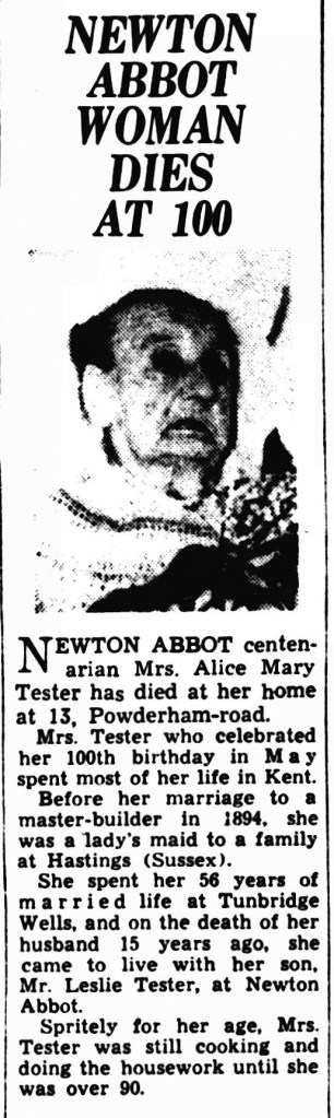 Then when Alice Mary died 3 months later there was a report in the Torbay Express on the 12 September 1970. These give us a little family history too and confirm what I thought, that she was living with her son Leslie in Devon.