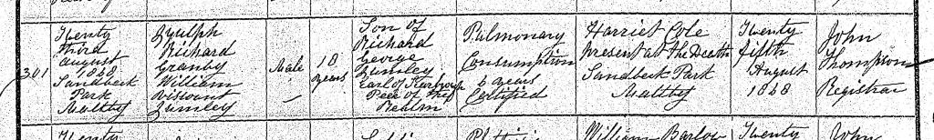 Reported in the Newcastle Journal, 26 August 1868, “We sincerely regret to make the intimation that Lyulph Richard Granby William, Viscount Lumley, eldest son of the Earl of Scarborough, and heir presumptive to the honours of the family, died on Sunday, at Sandbeck Park. Viscount Lumley was born in 1850 and was consequently only 18 years of age. He was educated at Eton. He was styled as Viscount Lumley“.