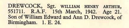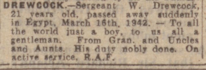 Percival had a sister and brother, brother William Henry Arthur Drewcock was born 28 October 1920. He died suddenly during WW2 on 15 March 1942, while serving in Egypt with the RAF as a Sergeant. His service number was 551711. He is buried in the Heliopolis War Cemetery. 1.E.24. On Nabil el Wakkard Street, Cairo, Al Qahirah, Egypt.