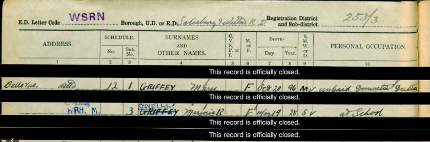 Mary and Marjorie’s Mum, Mary Ethel (Webb), died in 1953. I have a feeling they were close to their Mum, as I found their father, John Fernall Griffey was living away from the family on a couple of records, I think he’s got a story.