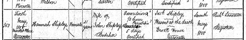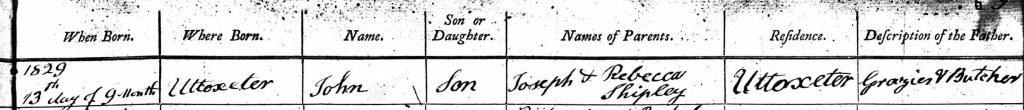 In 1861, when their son John Bowman Shipley (1858-1910) was just two years old, John was listed on the 1861 census as a widower, butcher and grazier of 30 acres of land. Living in the marketplace at Uttoxeter.