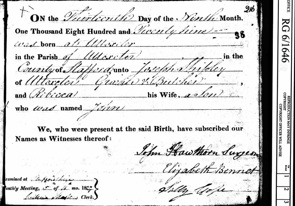 Mary Elizabeth Shipley was born in January 1869 in Uttoxeter, Staffordshire. Her parents were John Shipley and Hannah Smith (1837-1878). They were also Quakers. Quaker records are always so informative; below are two showing John Shipley’s birth in 1829.