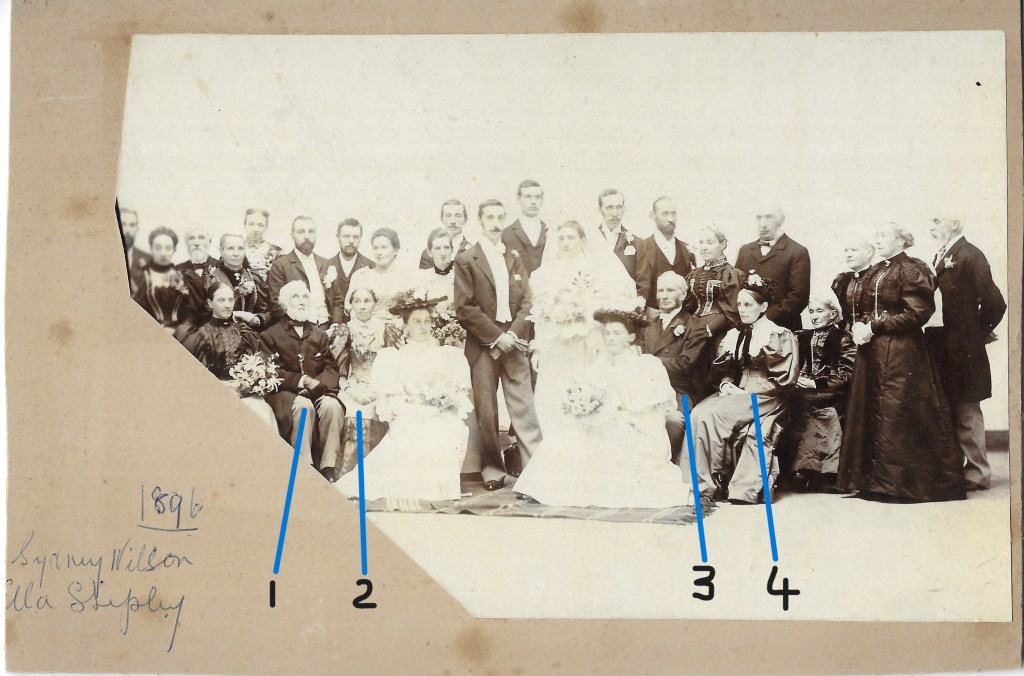 So now we can almost certainly identify four people in the wedding photo apart from Sydney and Ella. They are no 1 Charles Wilson 1813-1900. no 2 Susanna Jesper 1828-1916, Sydney’s parents. No 3 John Shipley 1829-1915, Ella’s father, and Anna Jesper 1839-1933, John’s third wife and Ella’s stepmother. Obviously, there are other close family members also in the photo; you can see the likeness with the couple.