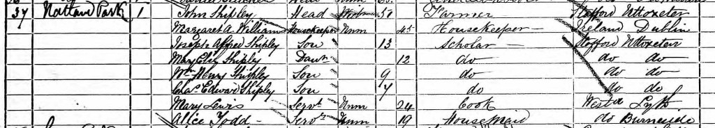 John Shipley married Hannah Smith in the second quarter of 1866, registered in Liverpool, Lancashire. The couple had four children, three sons, Joseph Alfred b1867, William Henry b1872, Charles Edward b1873 and Mary Elizabeth b1869. After Hannah died in 1878, we find John and his family, including Mary Elizabeth and her three full brothers, and staff, in 1881, living at Natland Park (farm), Kendal.