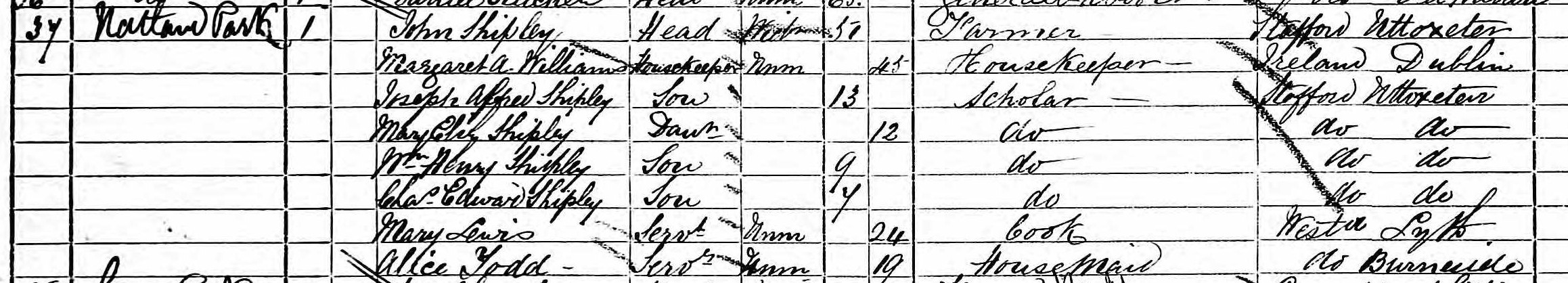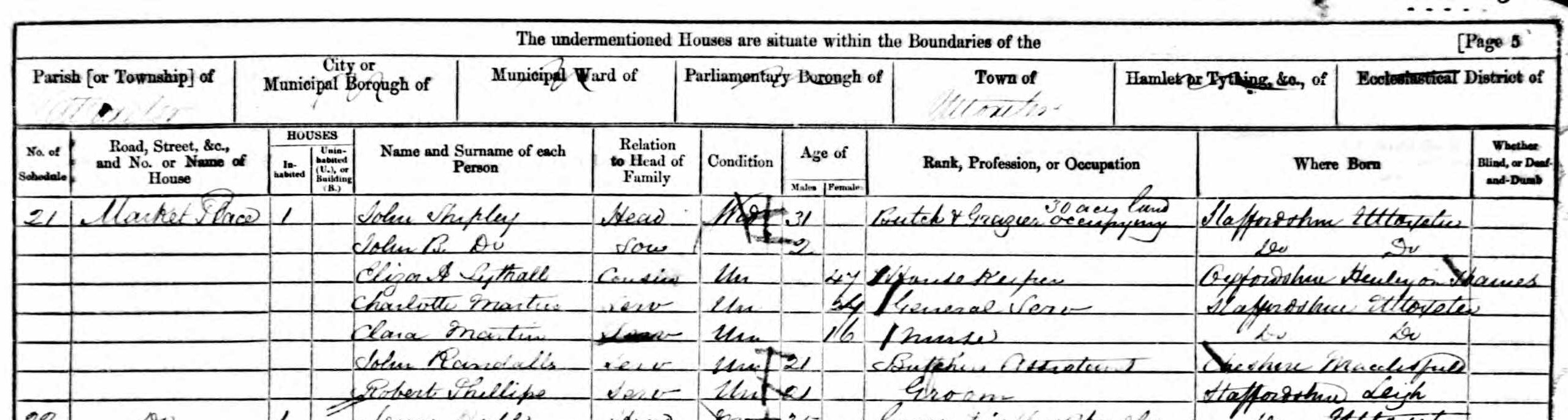 In 1861, when their son John Bowman Shipley (1858-1910) was just two years old, John was listed on the 1861 census as a widower, butcher and grazier of 30 acres of land. Living in the marketplace at Uttoxeter.