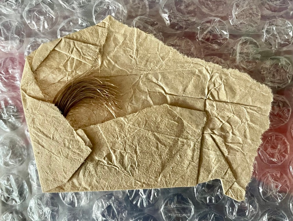 A lock of hair that’s been very carefully tied with cotton.
