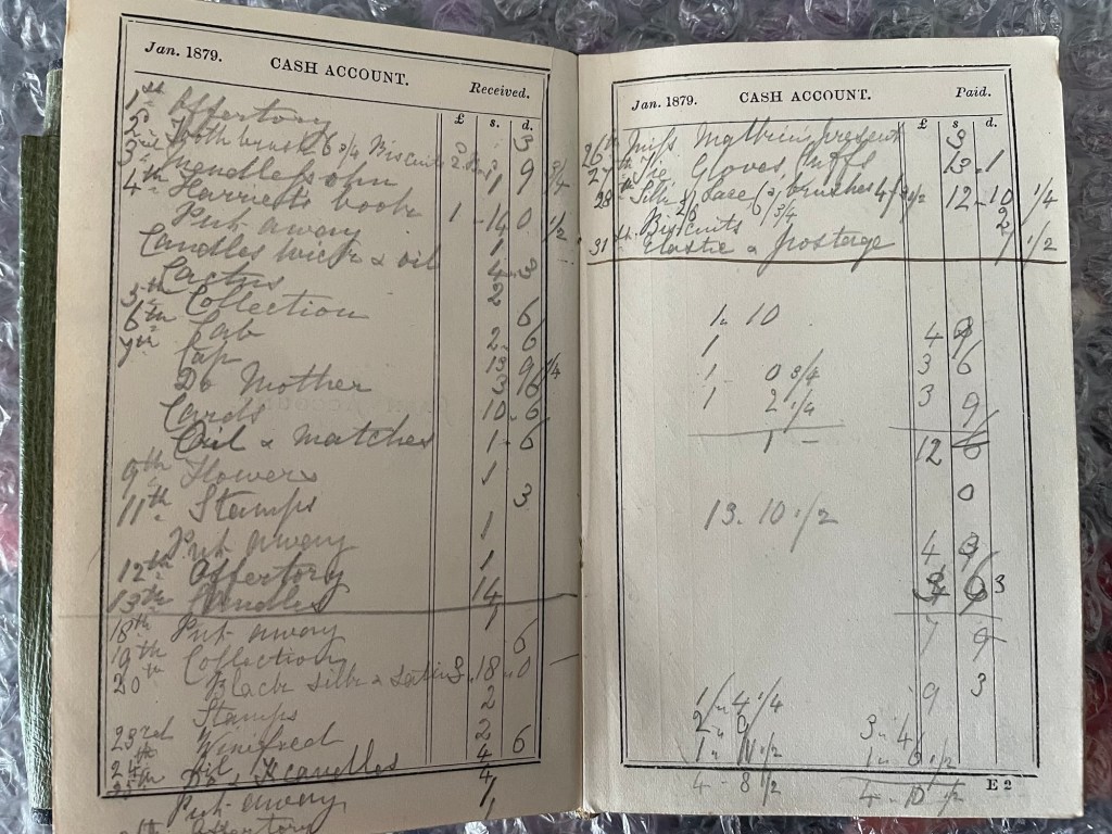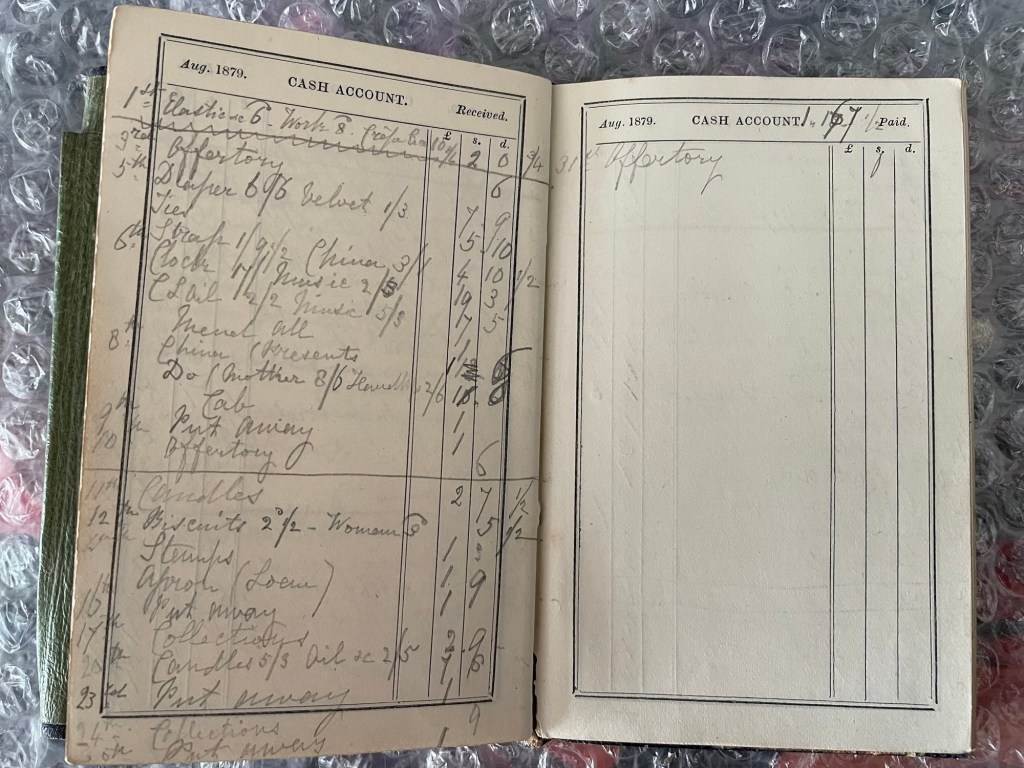 This month we have expenses for Elastic, a Draper’s bill, Velvet, a Strap, China (Presents), a Clock, Music, Stamps and Candles, plus various collections. Biscuits are also back on the expenses.