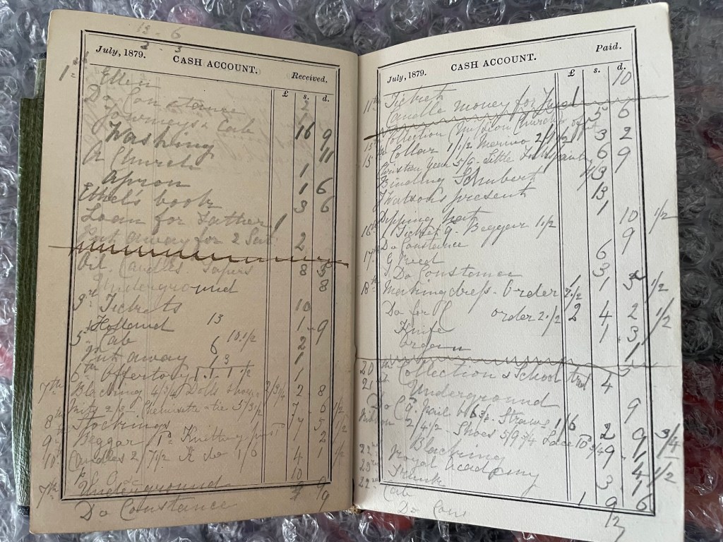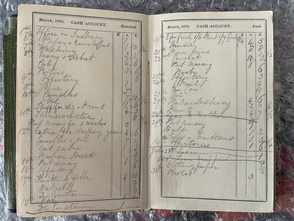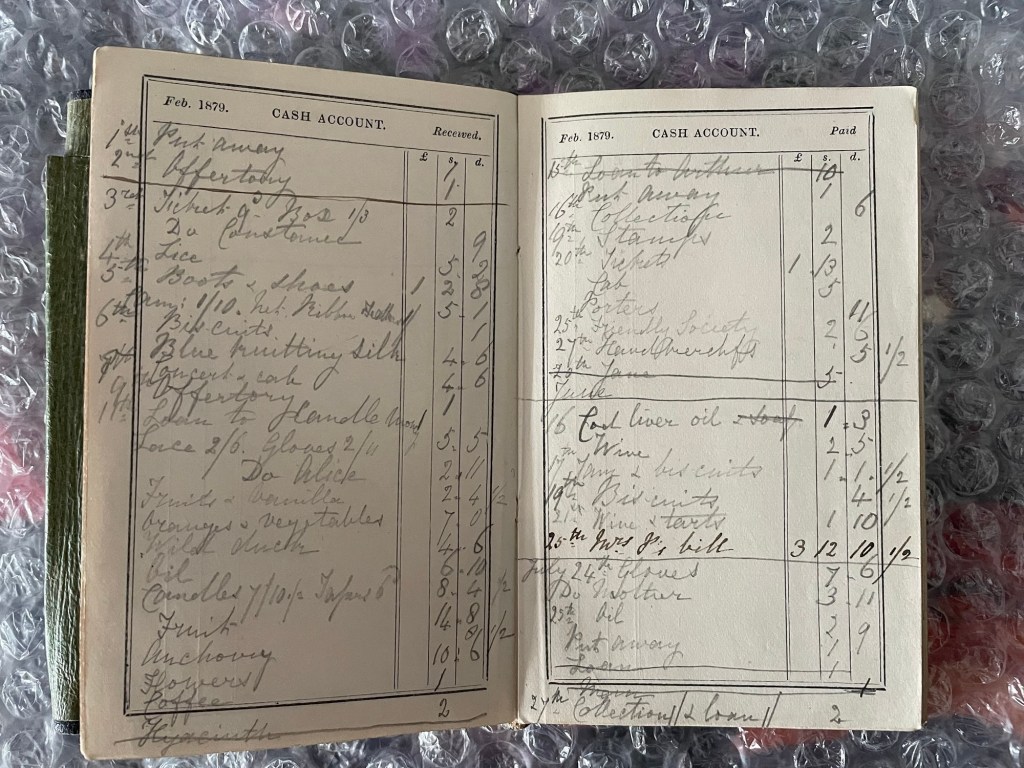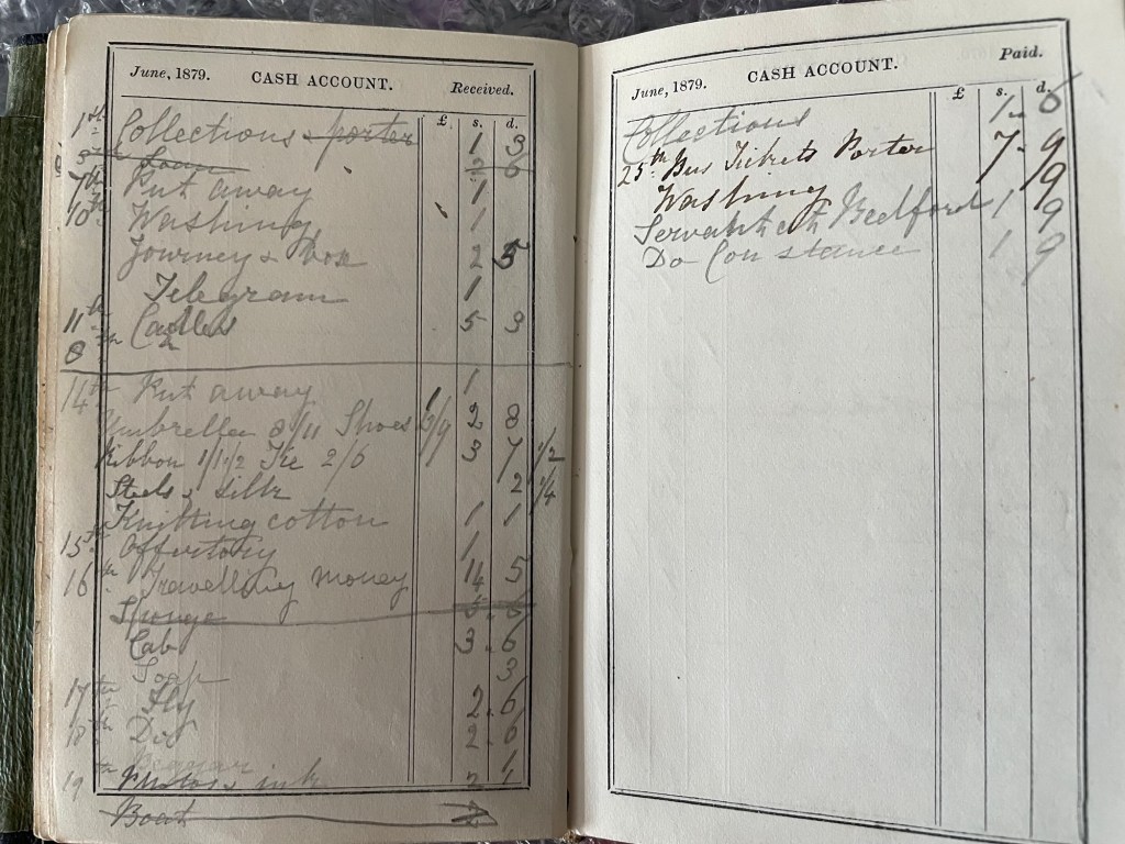 Reading her Diary entries, you would think that she led a fairly boring life compared to a young woman in her 30s today, but reading her expenses we can see that she certainly kept herself busy with various activities.