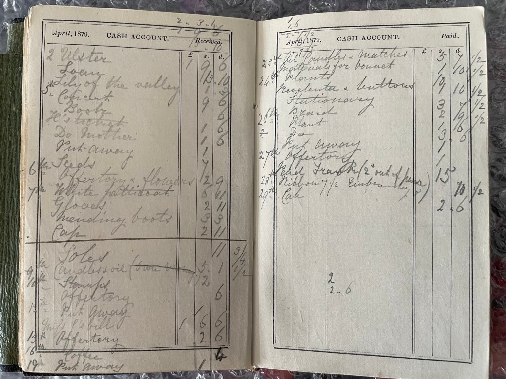 Julia bought some Lily of the Valley and other flowers, also two lots of plants and seeds this month, wonder what plants and seeds they were? White Petticoat, Material for a Bonnet, Braid, Buttons, Ribbon, Embroidery, Gloves, a cap, she paid for her Boots to be mended and bought Soles, Coffee and Stamps, Candles, Matches and Oil. She also continued to ‘put away’ some money.