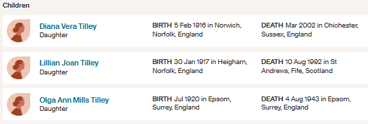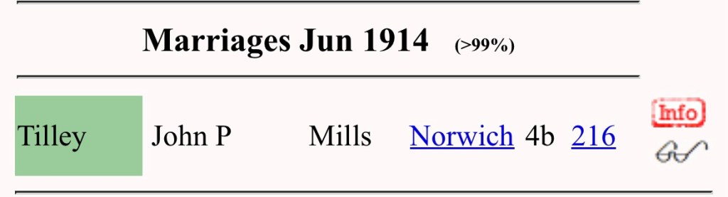 Olga L M Mills married Tilley. So now I need to find out his full name. So again I do another search on FreeBMD for Tilley marrying Mills.