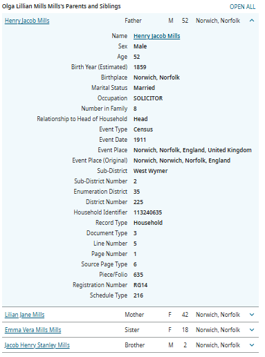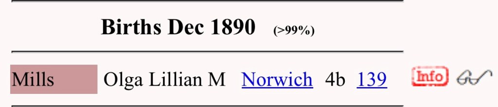 As Olga L. M. was quite unusual, I conducted a birth search and wasn’t surprised when I saw she was born in the Norwich area, matching the location of her marriage.