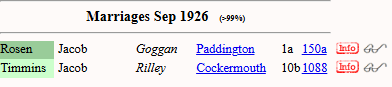 My starting point to find this bride and groom was again FreeBMD. I entered Jacob with no surname and spouse Edith with no surname in the third quarter of 1926. I had two results.