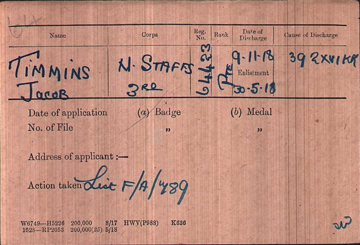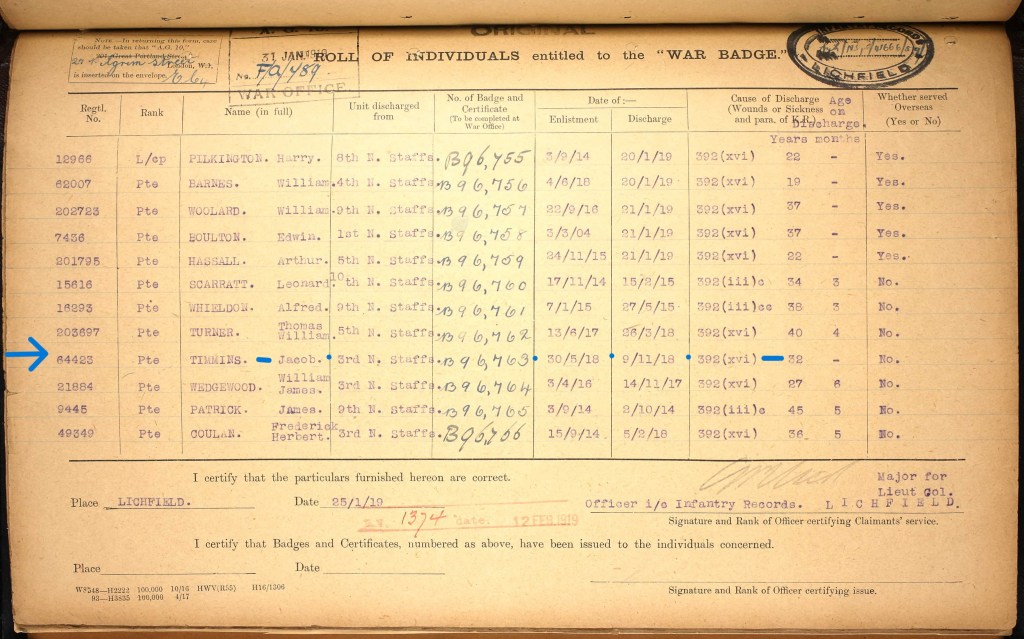 Jacob Timmings enlisted on 30 May 1918 and was discharged on 9 November 1918. As you can see above, Jacob was awarded the Silver War Badge. “The Silver War Badge was a British medal awarded during World War 1 to service personnel who had been honourably discharged due to wounds, sickness, or other disabilities sustained during the war“.