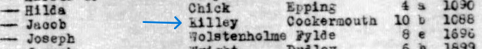As you can see, it could also be Killey, not Rilley. So I did a search with Killey, and that was correct, Edith Killey married Jacob Timmins, registered in Cockermouth, Cumberland.