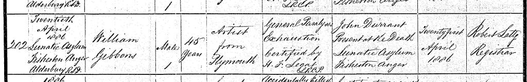 William Gibbons’ Cause of Death was General Paralysis and exhaustion, from GRO. Did he suffer a stroke?