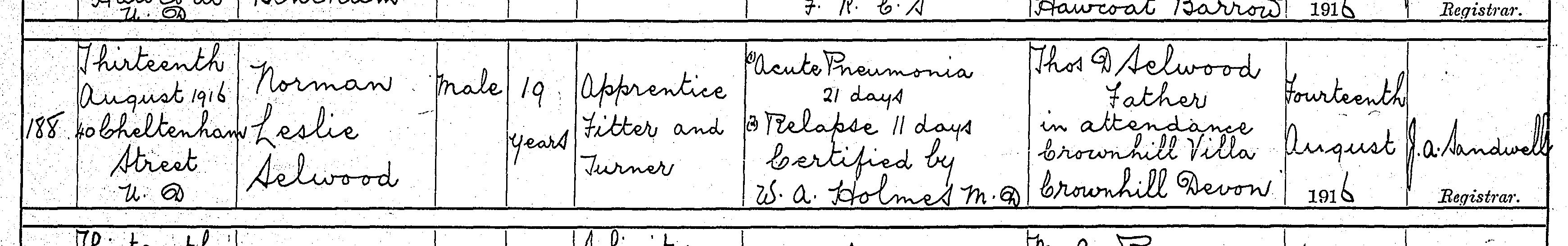 Norman Leslie Selwood’s cause of death was acute pneumonia 21 days, relapse 11 days.