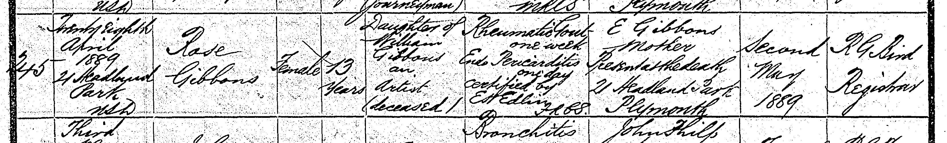 Rose died on 28 April 1889; the cause of death was rheumatic gout and endo pericardites.