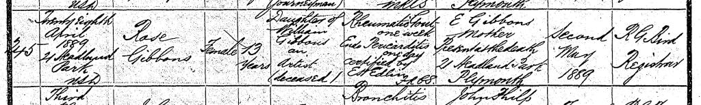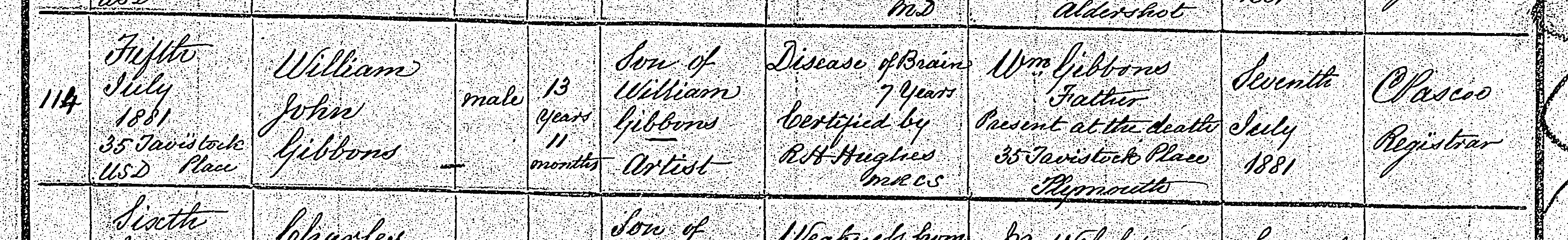 By 1881, the Gibbons family had firmly planted their roots in Plymouth. William, married and head of the household, was listed proudly as an Artist (Painter), a career he had steadily built over decades. Yet even as his work flourished, sorrow touched the family. Later that same year, their eldest child, William John, died on 5 July 1881 in Plymouth.