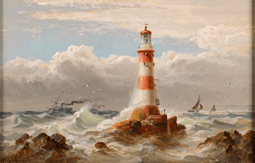 William overcame a difficult childhood in 19th-century Exeter to pursue his passion in Plymouth. There, working initially as a photographic artist, he developed a reputation for capturing the sea’s many moods, from gentle harbour scenes to dramatic shipwrecks, earning the respect of the local art community. The Box, Plymouth’s Museum and Art Gallery, holds at least seven artworks by William Gibbons in its collection. The four paintings above are in their collection. Other William Gibbons paintings are held by the Government Art Collection and the Royal Albert Memorial Museum and Art Gallery in Exeter, Devon.
