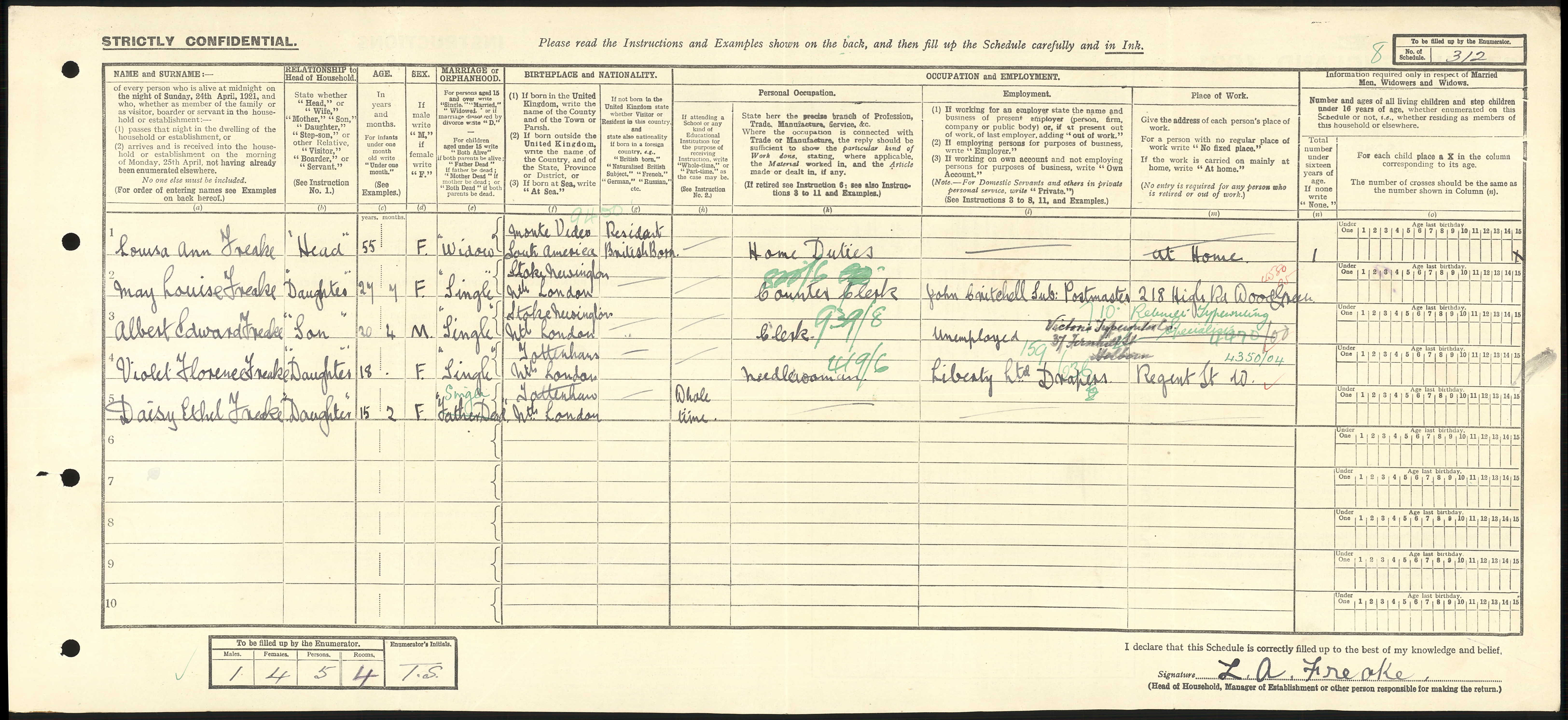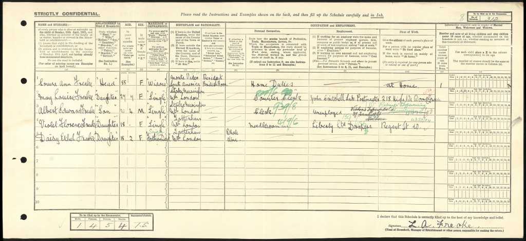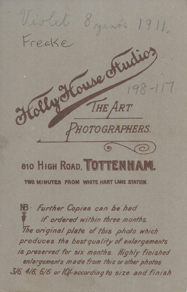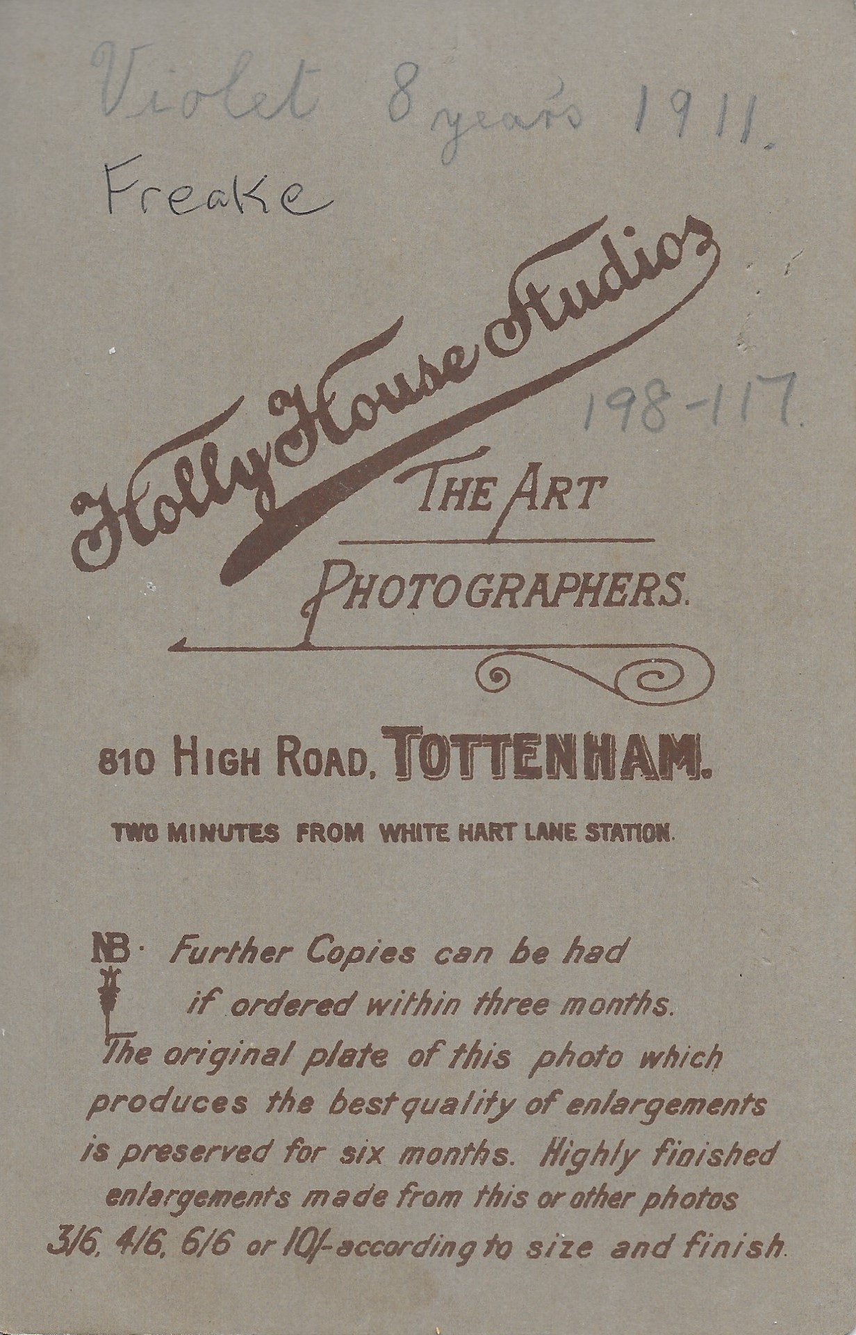 Between the turn of the century and the years just after, the Freakes were living in Tottenham, Middlesex. There, they continued to grow their family. Albert Edward was born on 17 February 1901 in Stoke Newington, followed by Violet Florence, born on 19 June 1903 in Tottenham. Their youngest child, Daisy Ethel, arrived on 27 April 1906, also in Tottenham.