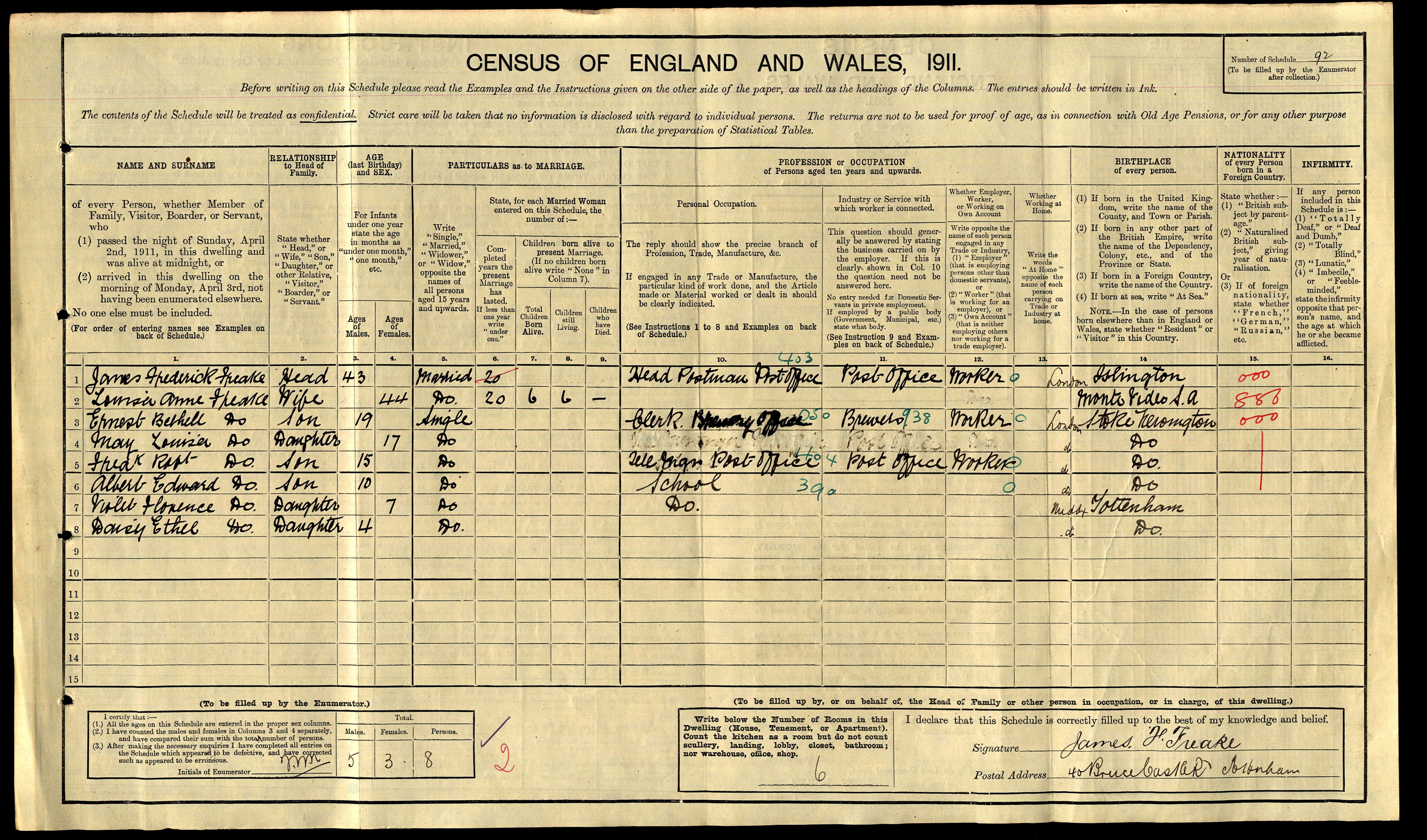 The family remained rooted in Middlesex through the early 20th century. James died in 1920 at the Prince of Wales Hospital in Tottenham, leaving Louisa a widow. She continued to live in Middlesex until her death in 1939.