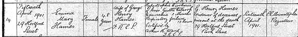 Emma died on 12 April 1901 at the age of 48. Her cause of death was ‘hypertrophic cirrhosis of the liver’, the most common cause of this is heavy alcohol consumption, which can cause liver inflammation and damage, eventually leading to cirrhosis. Other causes of cirrosis are Hepatitis B and C viruses can lead to cirrhosis, so can nonalcoholic fatty liver disease (NAFLD). It looks like she had been poorly for 2 months before her death.