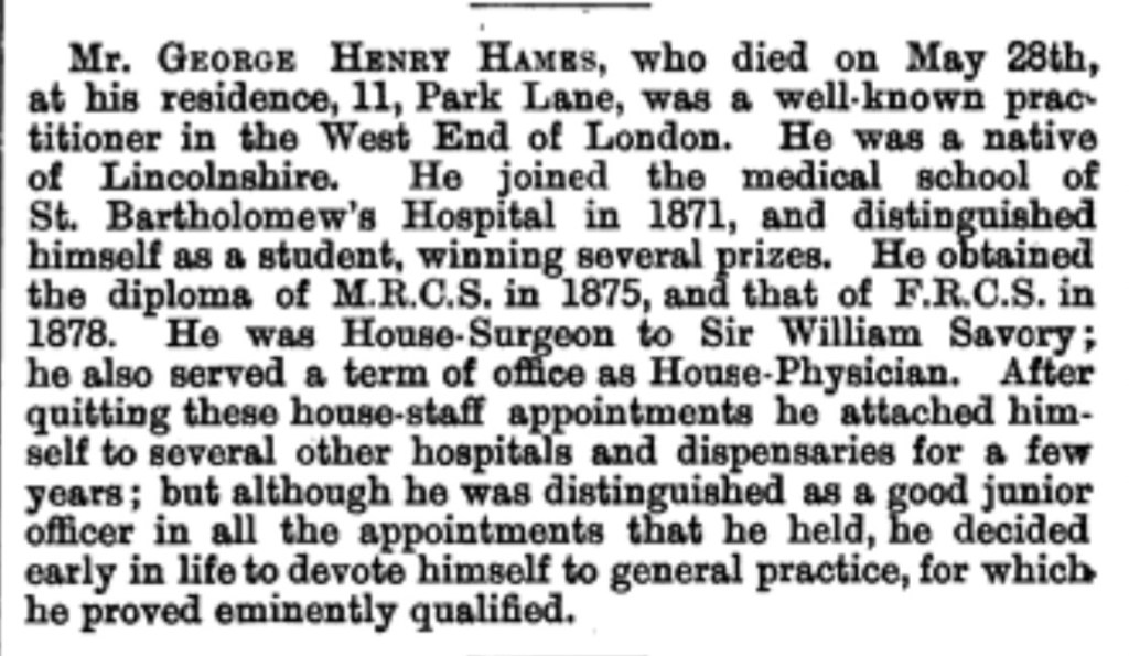 He entered St Bartholomew’s Hospital in 1871 and distinguished himself there, gaining the Foster Prize in 1872, being Brackenbury Medical Scholar in 1875, and Kirkes’ Scholar and Gold Medallist. He was House Surgeon to G W Callender (qv) in 1875 and House Physician to Reginald Southey in 1876-1877. Meanwhile, in 1873-1874, he was Prosector at the Royal College of Surgeons and for some years Hon Secretary of the Abernethian Society. After leaving St Bartholomew’s, he studied at the Rotunda Hospital, Dublin, was a Chloroformist at the Cheyne Hospital for Children, and Surgeon to the Western General Dispensary. He became a well-known practitioner in Mayfair at 29 Hertford Street, 125 Piccadilly, 113 Sloane Street, and died at 11 Park Lane on May 28th, 1909.