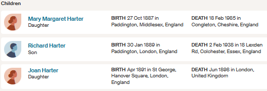 As you can see, their youngest child, Joan, was just seven when she died. Richard became a Lieutenant Commander in the Royal Navy. Mary Margaret married Cyril Schneider Crofton in 1919; he was a Captain in the Royal Fleet Auxiliary (RFA) in 1921. The couple had four children.