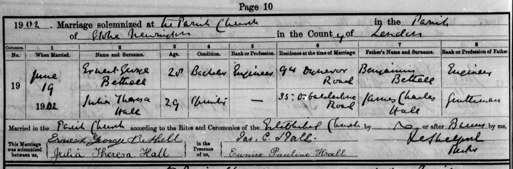 Second born, Julia Theresa Hall, 1873-1951, was a servant in 1891, just like her sister Maud, and then she met and married Ernest George Bethall, who was an engineer.