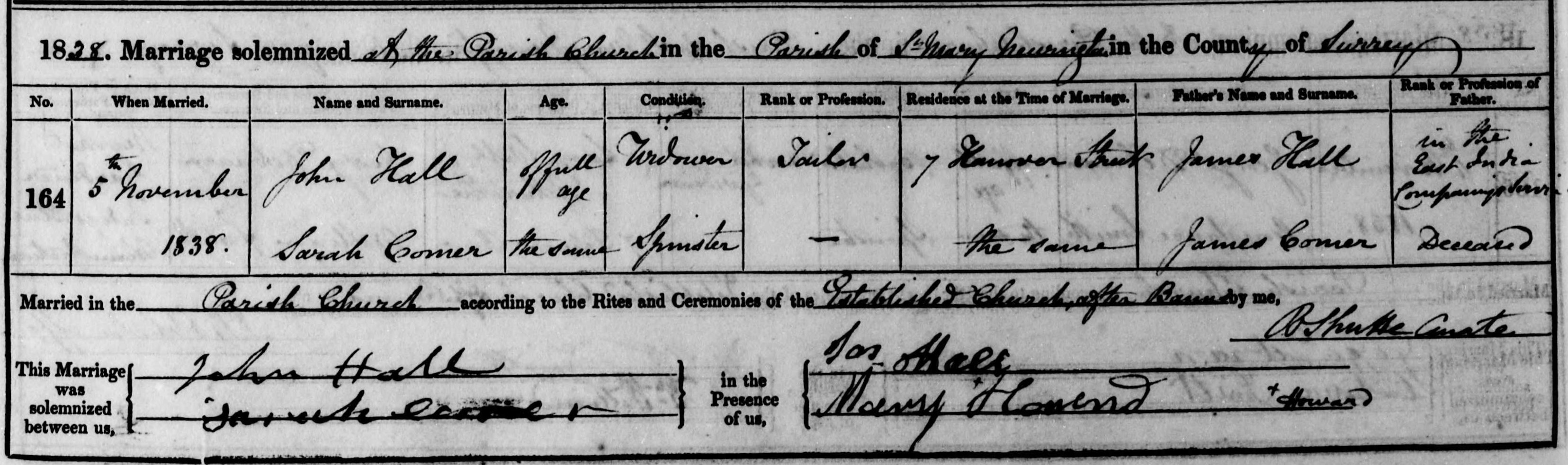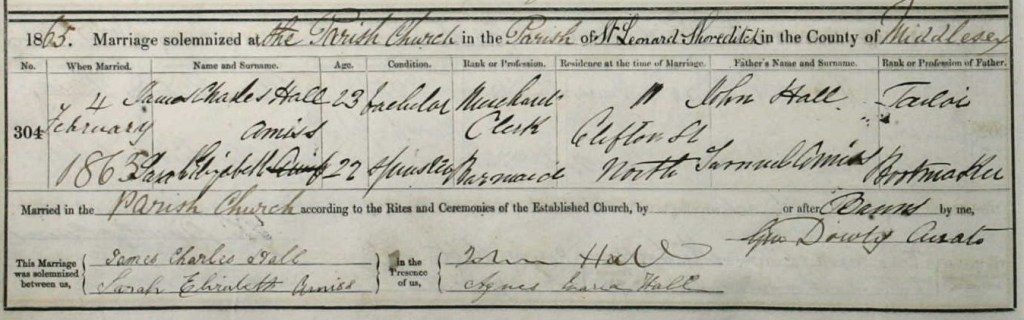 James Charles Hall was born in 1842 in Shoreditch, Middlesex. His parents were John Hall and Sarah Comer, mispelt in some records as ‘Corner’. They had married in the parish Church of Newington, Surrey, on 5 November 1838. At the time of their marriage, John was a Widower, and his occupation was a Tailor.