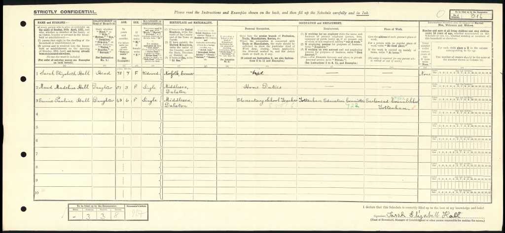 James and Sarah had four children during their marriage: The eldest was Maud Madeline Hall, 1870-1953. Maud never married and had no occupation after 1891, when she was a housemaid to a family in Stamford Hill, London. She lived with her widowed mother and sister, Eunice, who was also still single then in 1921.