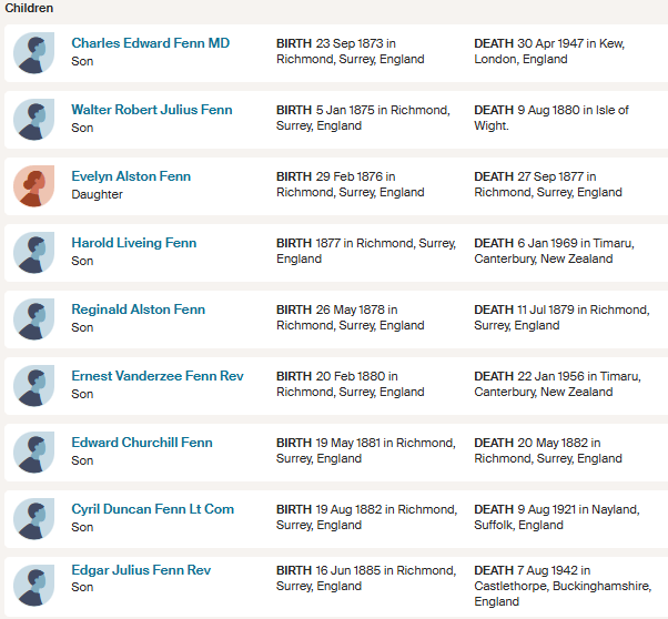 The couple’s three children were Robert Liveing Fenn, Thomas Harrold Fenn and Elizabeth Fenn.