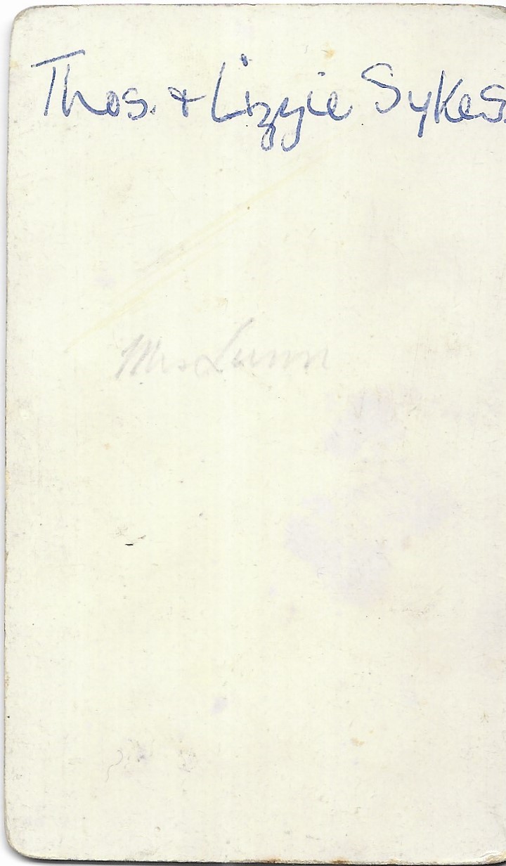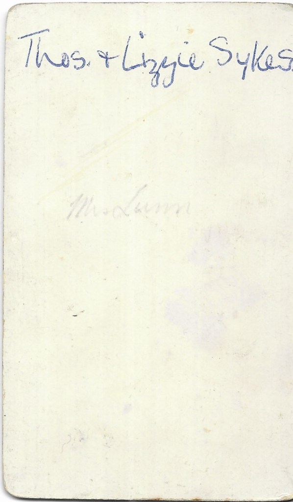 As I researched the family of Thomas and Lizzie, adding more family members, I just had the feeling this was the correct couple. Then, on a public tree on Ancestry, a photo hint came up, and I couldn’t believe I was actually looking at a photo of Thomas Sykes, matching my Thomas. I went to the tree, and they also had a photo of Lizzie! Both the photos below were taken in the early 1900s I think.